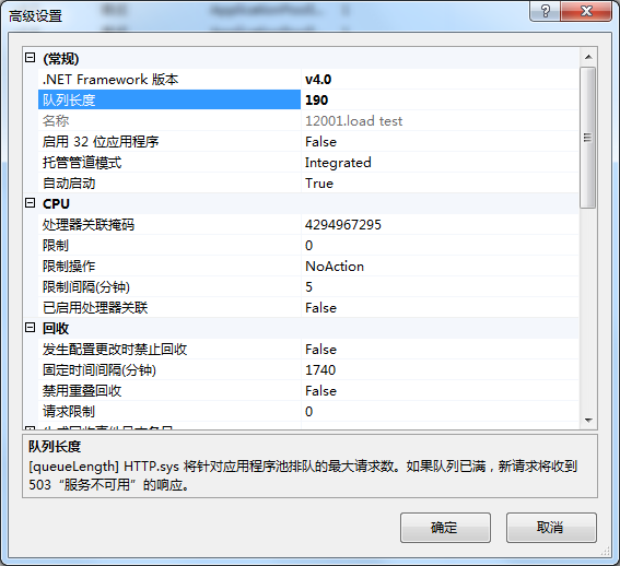 队列长度:在IIS中选中【应用程序池】,在应用程序池列表中,右键你想查看的,在右键菜单中选择【高级设置】。打开如下对话框: