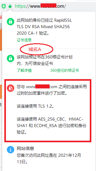 通过对比,可以看到,域名B因为使用的是 TLS 1.0,所以会出现问题