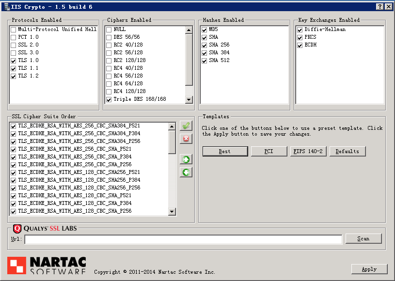 下载IISCrypto.exe 点击best 工具自动推荐选中 也可以定义勾选 选择配置完成 然后点击”apply“ 软件弹窗提醒你 手动重启服务器。