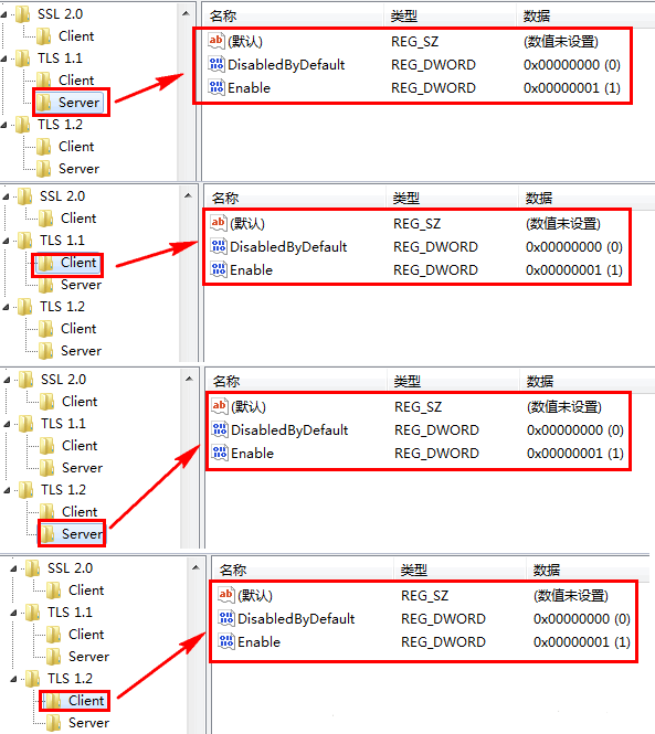 打开HKEY_LOCAL_MACHINE\SYSTEM\CurrentControlSet\Control\SecurityProviders\SCHANNEL\Protocols\SSL 2.0\Client 配置如下