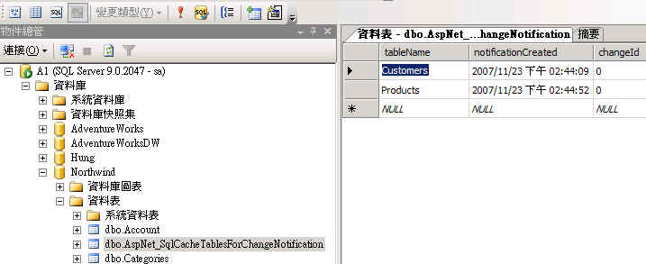 图 4 启用 SqlCacheDependency 后,自动添加用来监听的表