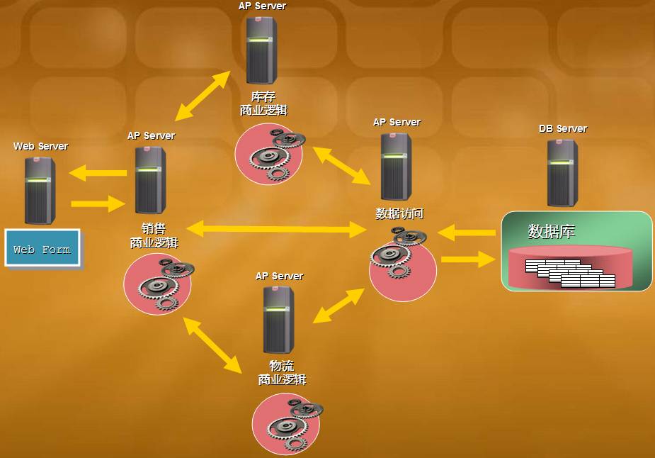 根据 Martin Fowler 在 P of EAA 里的說法:Layer 是指「逻辑」上的分层 (logical separation),Tier 是指「物理」上的分层 (physical separation)。若我们的 ASP.NET 站台,是用「虚拟」的分层 (N-Layer),来切开 UI - BLL - DAL,通常不会有性能上的问题;但若是用「物理」的分层 (N-Tier),亦即如上图 2 和下图 3,可能每一台 AP Server 都负责不同的商业逻辑 (销售、库存、物流、制造、会计、...),各自的源代码都存放在不同的物理主机上,且可各自独立运作,此时就要考虑到每一台 AP Server 在彼此协调合作,以及调用 Web Service (XML 的性能不佳)、执行分布式事务上的性能问题。